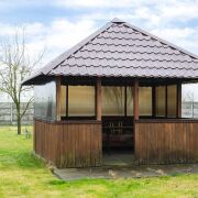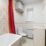 - Выполнена внутренняя отделка. На полу бетонная стяжка с линолеумом, санузел облицован плиткой, стены оклеены обоями, установлены окна ПВХ. Санузел совмещённый, пол в санузле с подогревом, в доме есть ванная и туалет, что обеспечивает наличие всех базовых удобств.