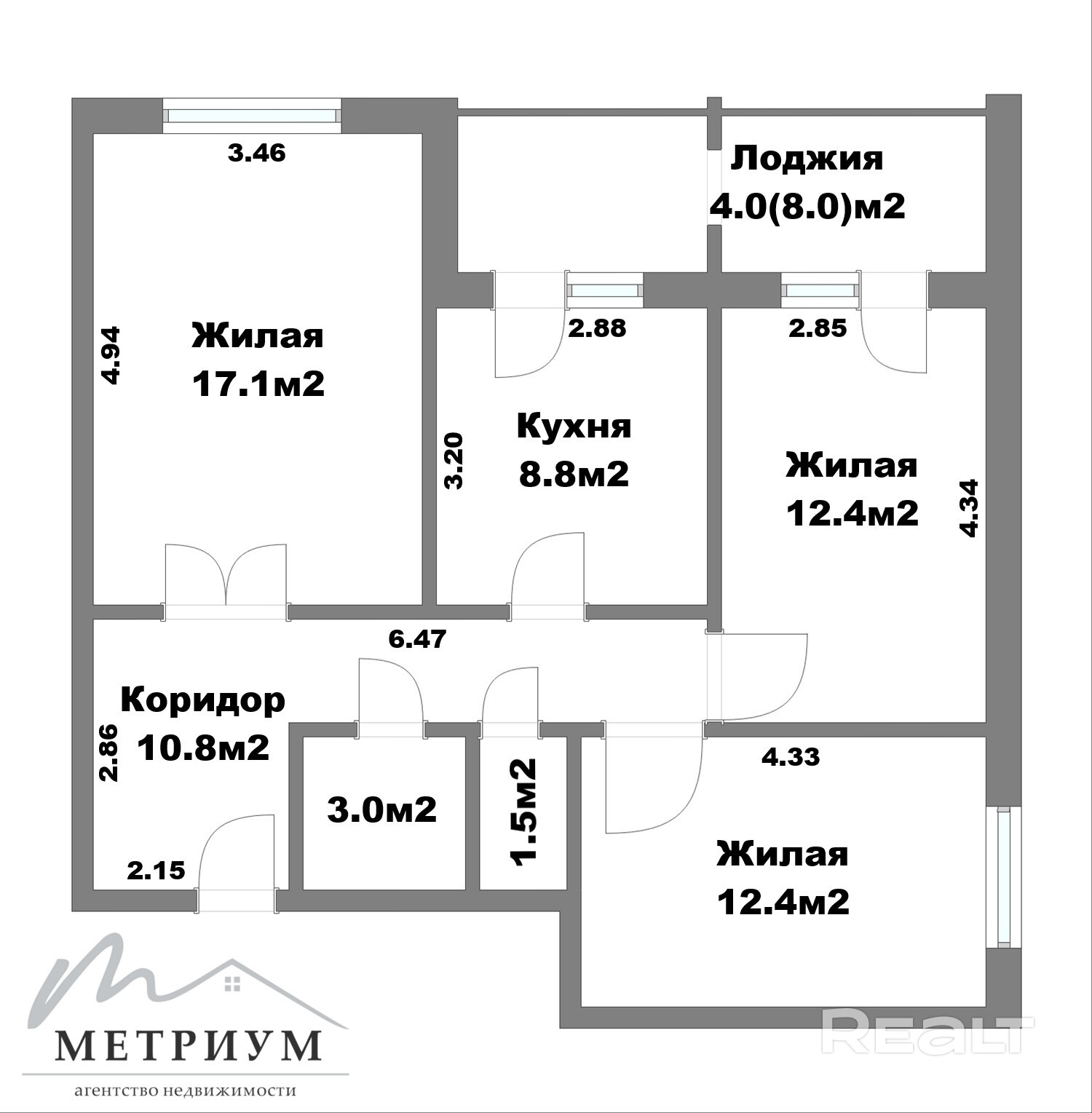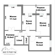 Улучшенная планировка: кухня 8,8 кв.м., 3 большие комнаты, большая лоджия с выходом на кухню и комнату.