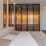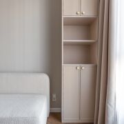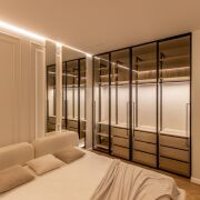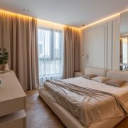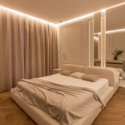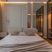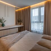 Спальня 13,5 м2 с двуспальной кроватью и анатомическим матрасом Infinity премиум-класса , встроенный шкаф со штангами и выдвижными полками с подсветкой через пульт. Установлен кондиционер Haier. Контурная подсветка скрытого карниза.