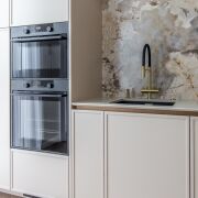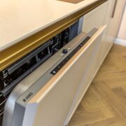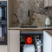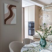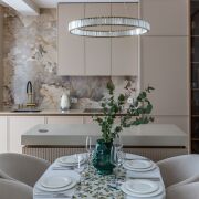 В зоне кухни встроенная кухня под потолок с островом. Крашеные фасады, фурнитура Blum, столешница выполнена из кварцевого камня, фартук кухни - широкоформатный керамогранит. Встроенная бытовая техника шведского производителя Asko : духовой шкаф , посудомоечная машина , варочная панель и свч -печь, кофемашина и чайник SMEG, холодильник Whirlpool 70 cм. Установлен измельчитель, фильтр с обратным осмосом, смеситель и мойка японского производителя Omoikiri.
