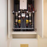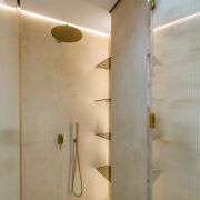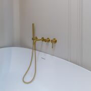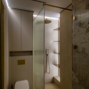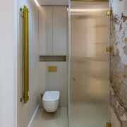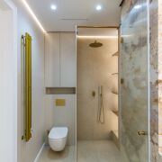 Санузел 6,7 м2 облицован широкоформатным итальянским керамогранитом , установлена душевая и отдельностоящей ванной из камня Аbber, матовый унитаз Ideal Standard AquaBlade, эксклюзивная итальянская сантехника Boheme, зеркало с подогревом, электрический полотенцесушитель, теплая стена, по периметру санузла и коридора теплый пол.