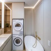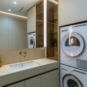 В квартире предусмотрена общая гардеробная с большим количеством мест хранения: штангами и выдвижными полками.