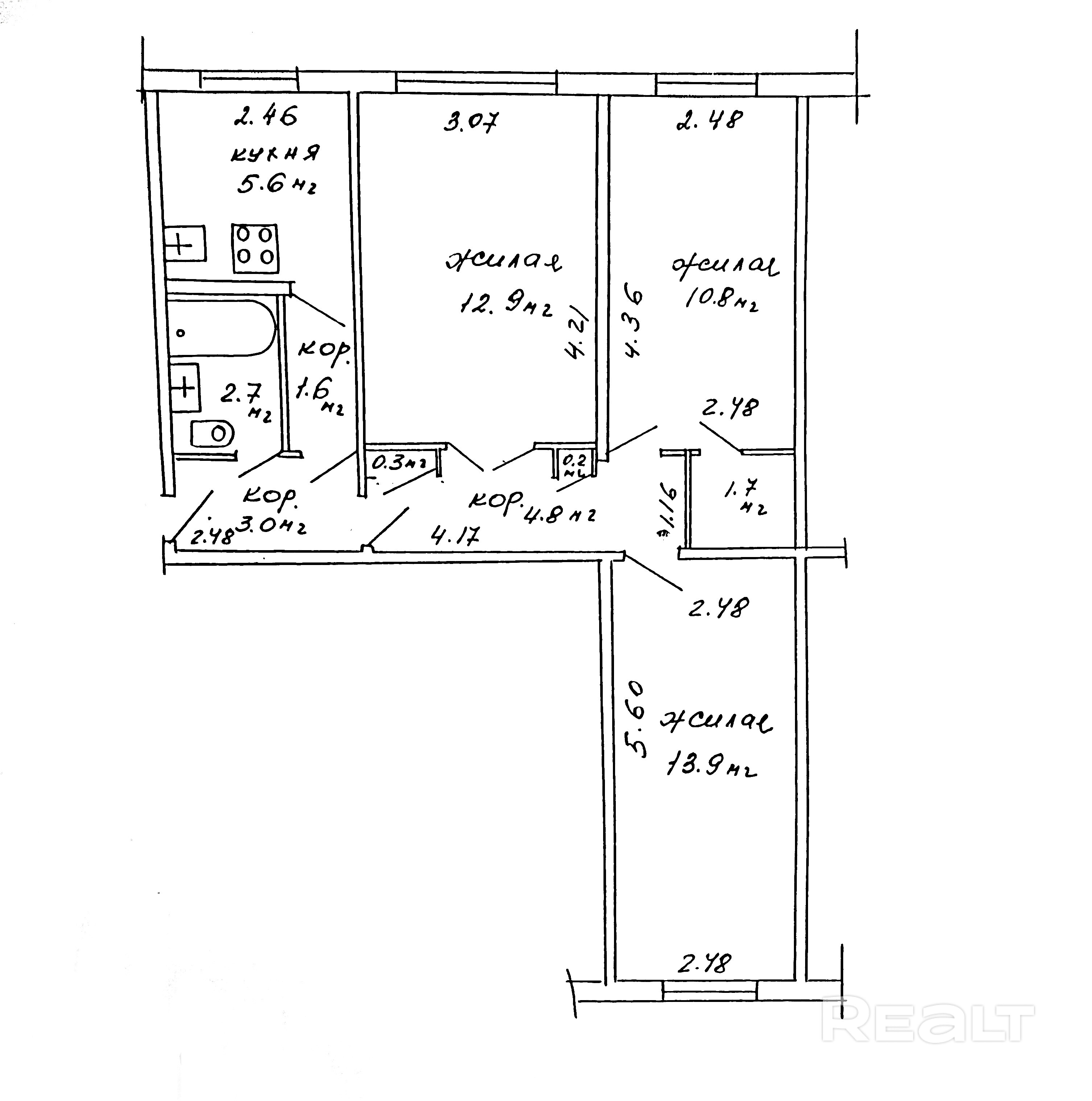 Квартира общей площадью 57.5 м2 по СНБ, с большими жилыми комнатами 13.9 м2, 12.9 м2 и 10.8 м2. Укомплектованная кухня 6.0 м2.