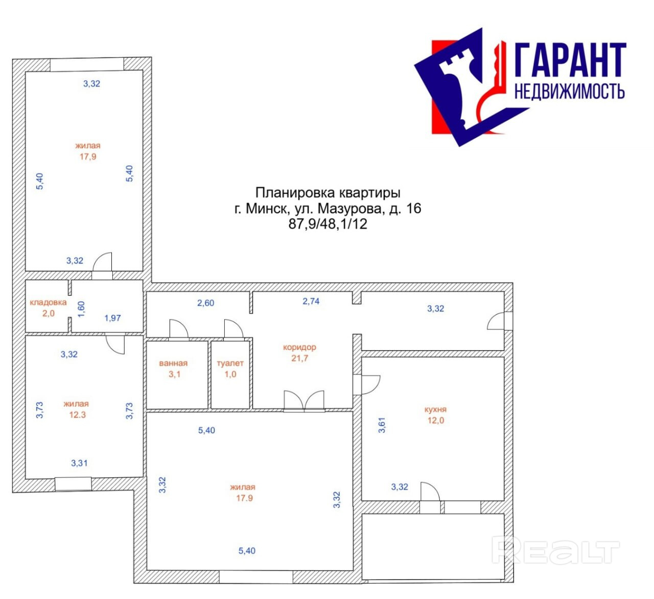 Улучшенная планировка: большая кухня 12 кв.м. с выходом на застекленную лоджию, все изолированные комнаты 17.9 кв.м, и 12,3 кв.м, просторный коридор 21.7 кв.м.