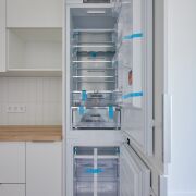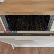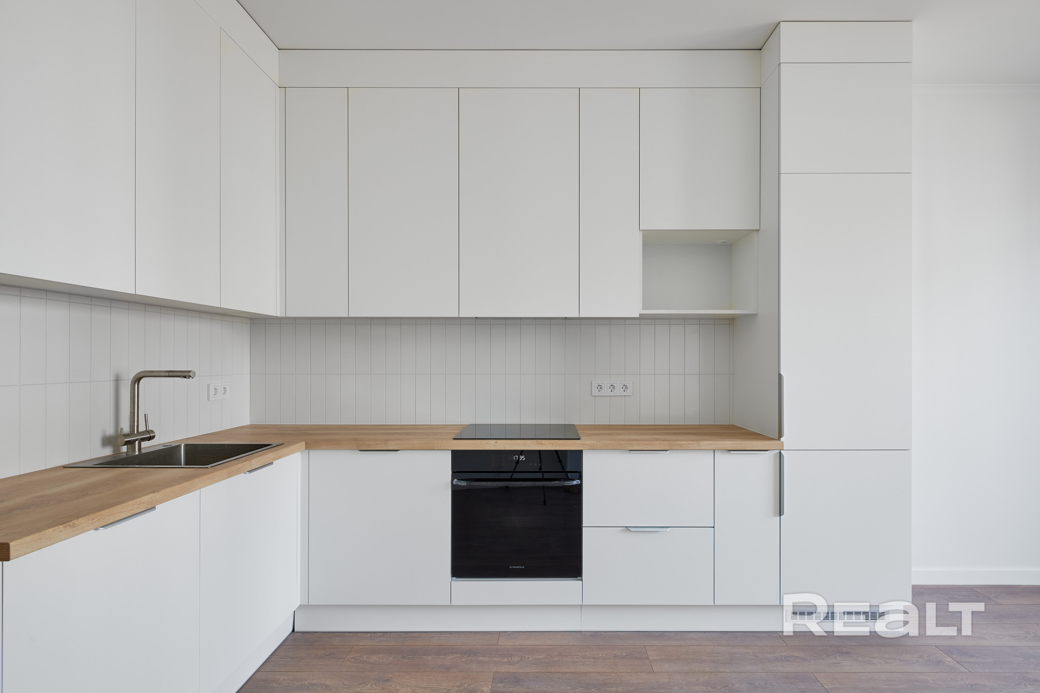 На кухне установлена техника фирмы MAUNFELD, встроенный холодильник с морозильной камерой фирмы Whirlpool.