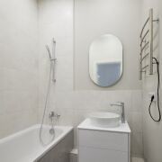 В ванной комнате: большая ванна; умывальник с тумбой; зеркало с подсветкой; батарея и дополнительно установлен электрический регулируемый змеевик.