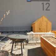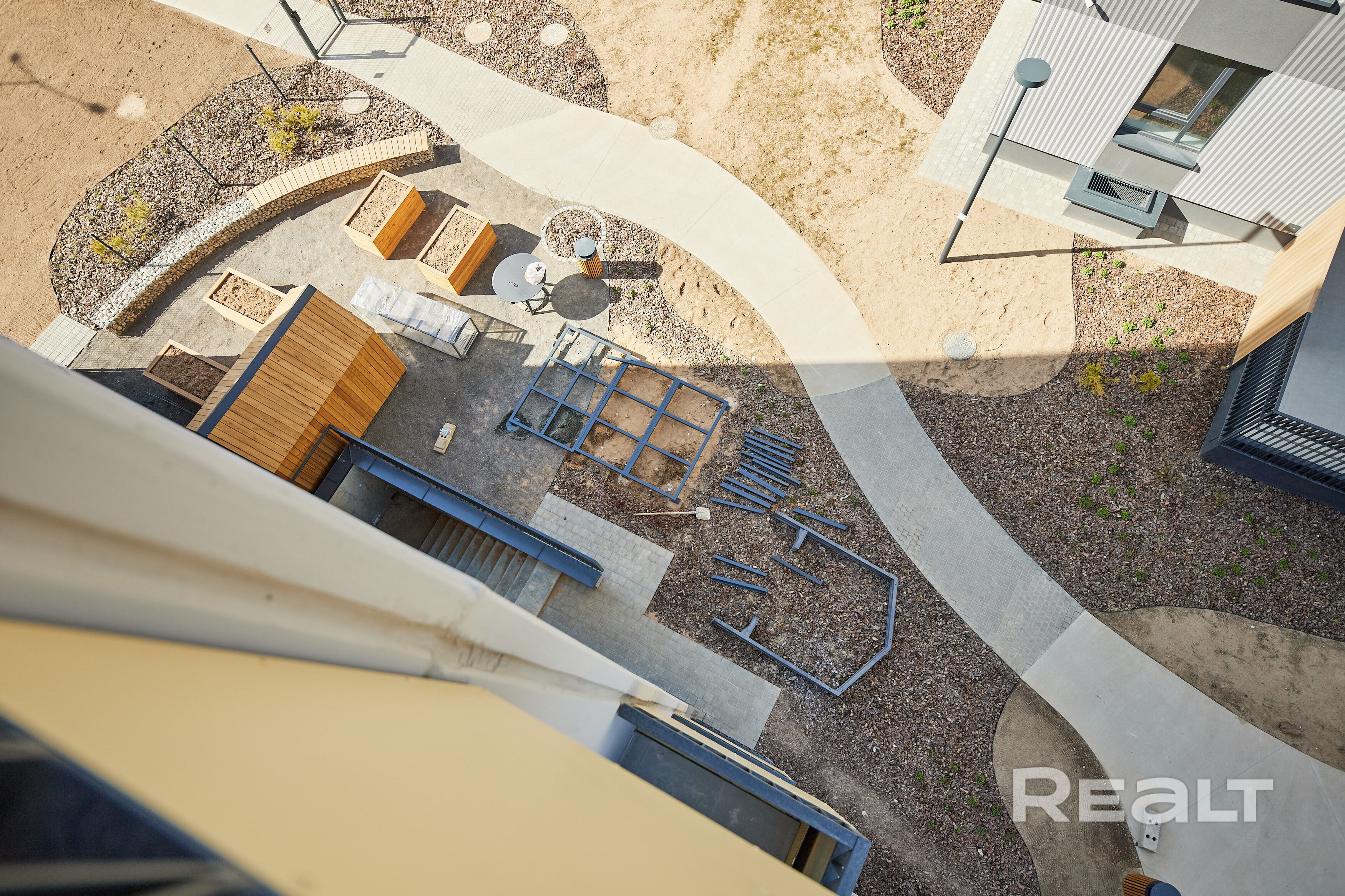 Отдельно внимание хотелось бы уделить закрытому двору, вход в который предусмотрен как с подъезда, так и через ворота. Во дворе обустраивается детская площадка, уже готова зона отдыха и барбекю.