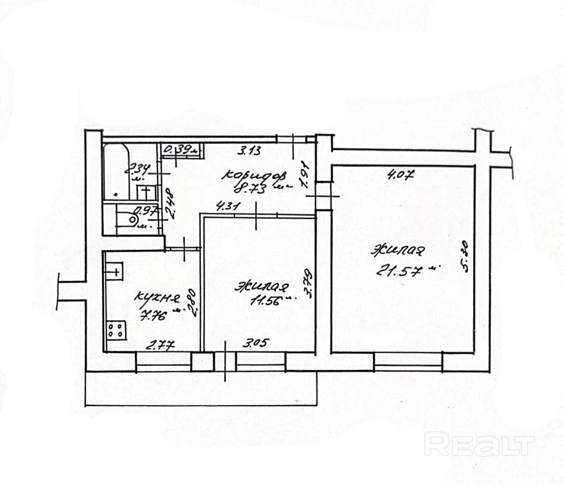 общая площадь 53,3кв.м., жилая: 33,13кв.м., кухня: 7,76кв.м - высота потолков 2.48м.