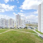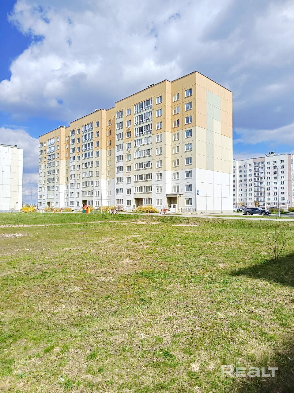 Вид из окна на просторный двор и Чижовское водохранилище.