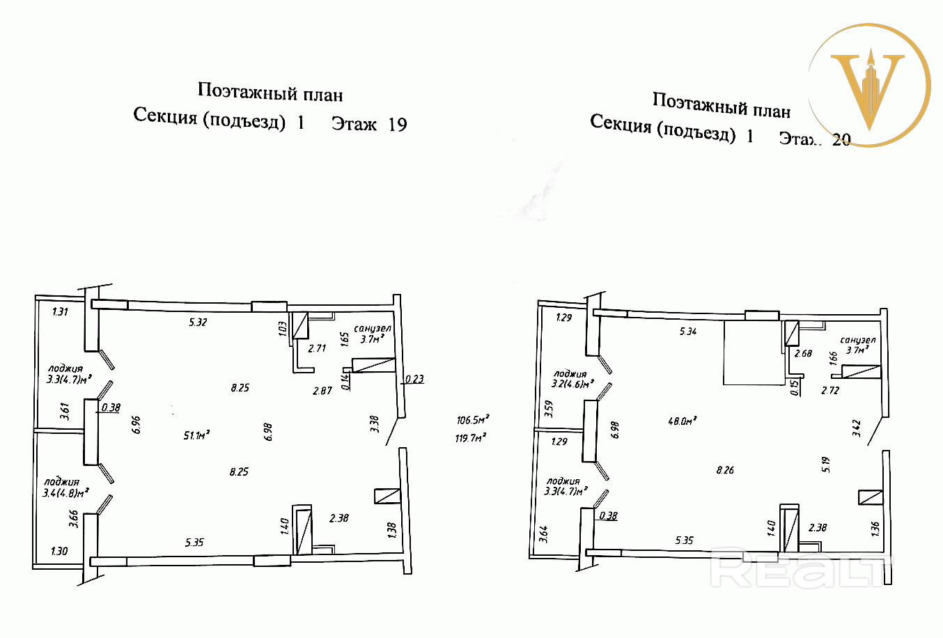 Общая площадь квартиры : 106.5 м2 (по СНБ — 119.7 м2)