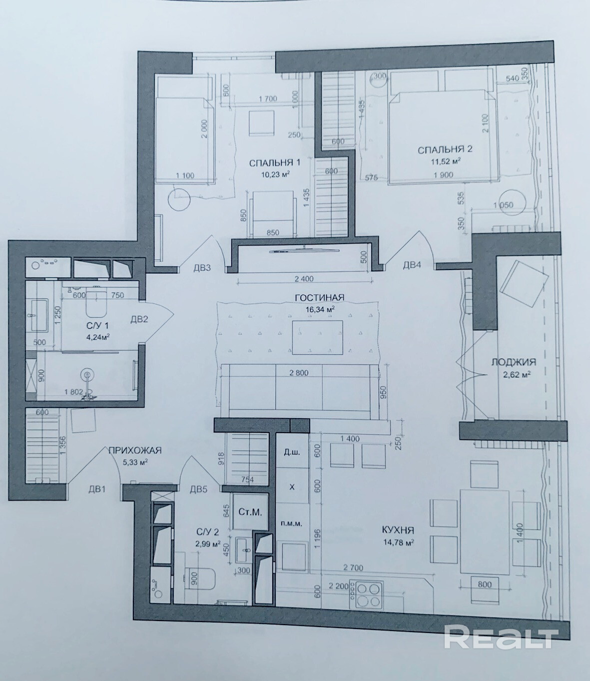 Высокие потолки (3 метра) дают ощущение простора и увеличивают пространство.