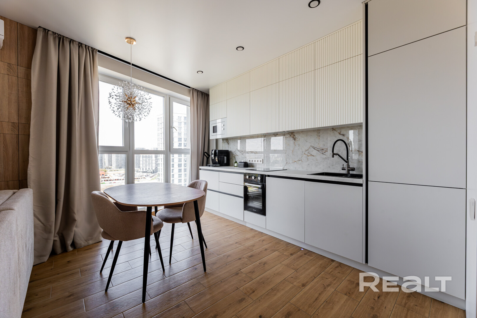 В квартире выполнен современный дизайнерский ремонт с качественными материалами, создающий атмосферу комфорта и стиля.