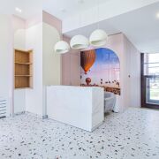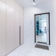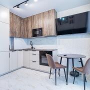 - Напольное покрытие в квартире - керамогранит. Потолок - натяжной с трекинговым светодиодным освещением. Стены - венецианская штукатурка.