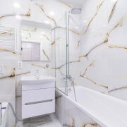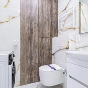 - Ванная комната облциована керамогранитом, потолок натяжной. Скрытая инсталляция, псевдобиде, качественная сантехника. Установлена акриловая ванна, что обеспечивает комфортные водные процедуры.