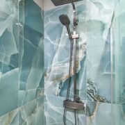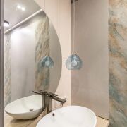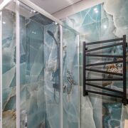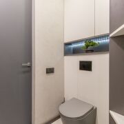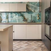 На полу плитка и влагозащитный, износостойкий ламинат.