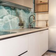 Встроенная кухня с варочная панелью, духовым шкафом, микроволновой печью и холодильником.