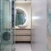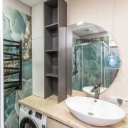 Просторная ванная комната с качественной сантехникой и стиральной машиной.