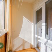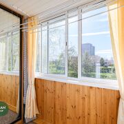 В жилой комнате установлен деревянный стеклопакет с заменой подоконника, на кухне – пластиковый стеклопакет, лоджия застеклена алюминиевыми раздвижными рамами.