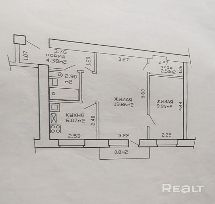 Большая комната (19,86 м2) может использоваться как гостиная, а меньшая (9,99 м2) — как спальня.