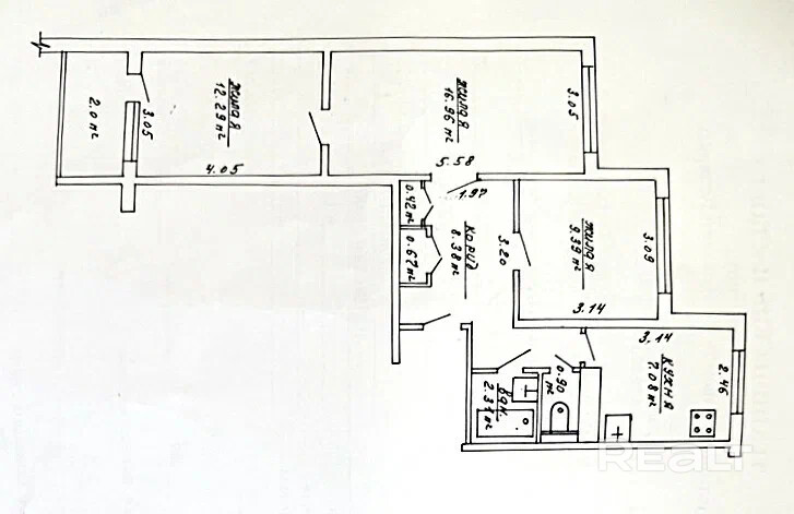 площадь общая – 58,4, жилая – 38,64, кухня – 7,08, по СНБ - 60.4, высота потолков