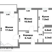 В квартире 2 жилые комнаты 17,0 м2 и 10,9 м2, кухня 7,2м2, общая площадь - 46,6 м2.