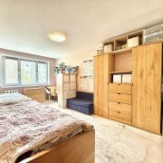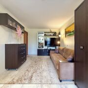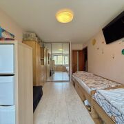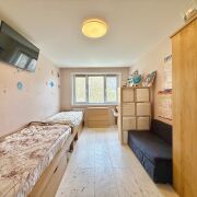 - спальня 17 кв.м., есть встроенный шкаф, стол, кровати, на полу пробковое покрытие;