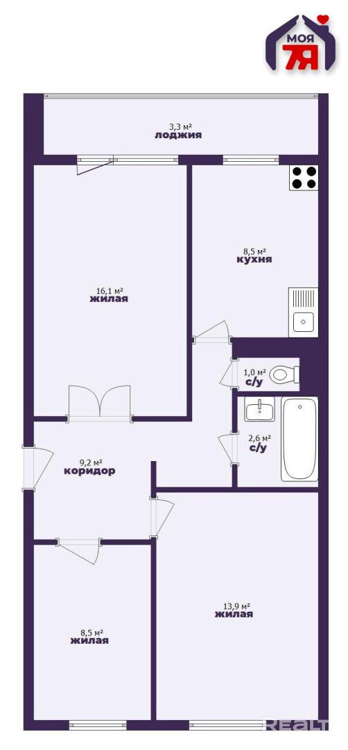 -  Лоджия, площадью 3,3 м2 позволит вам наслаждаться свежим воздухом и солнечными днями.