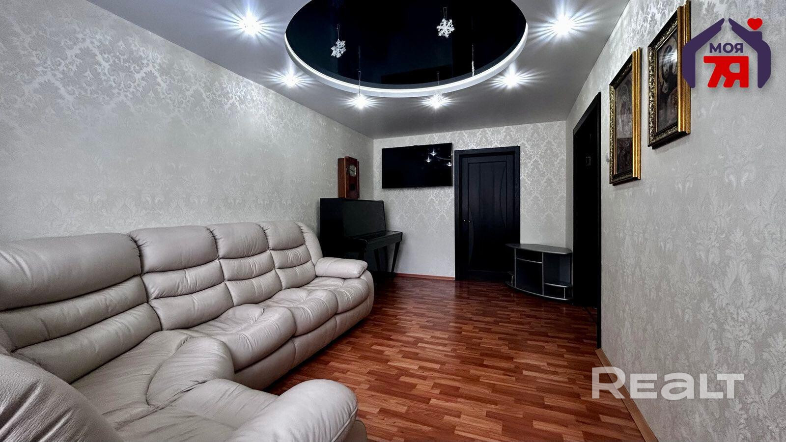 -Прихожая и коридор оформлены в едином стиле: натяжные потолки, ламинат, качественные межкомнатные двери тёмного цвета. Встроенный шкаф-купе с зеркальными фасадами визуально расширяет пространство и полностью решает вопрос хранения.