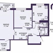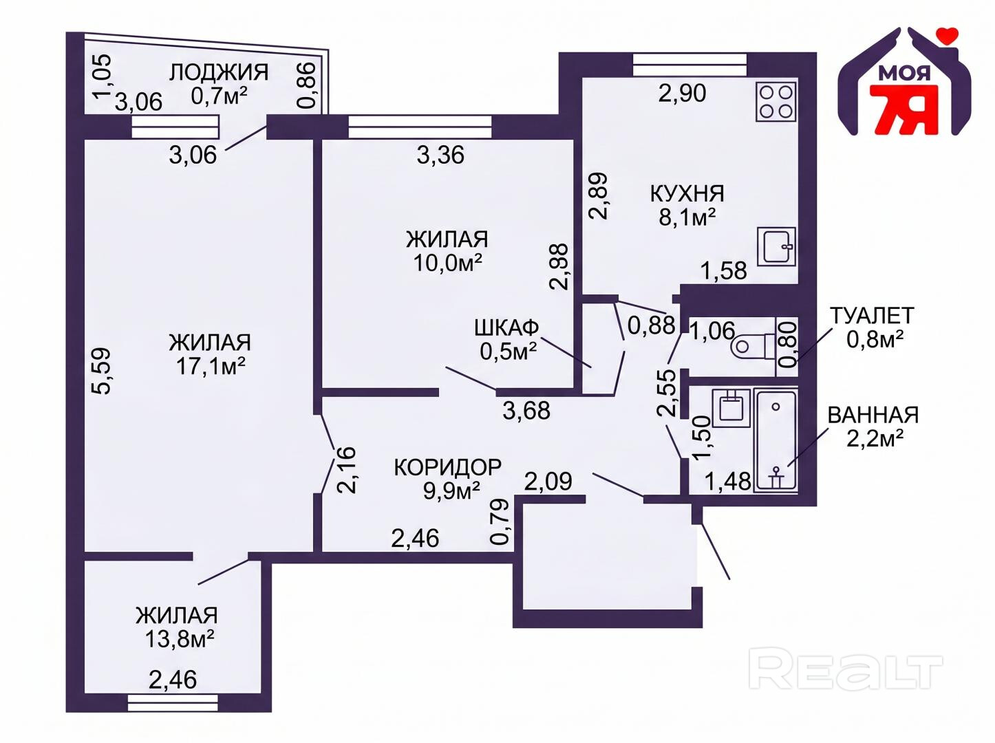 - Жилая площадь 40,9 м2 распределена очень рационально: три комнаты разных размеров подойдут для семьи с детьми или для создания уютного жилого пространства.