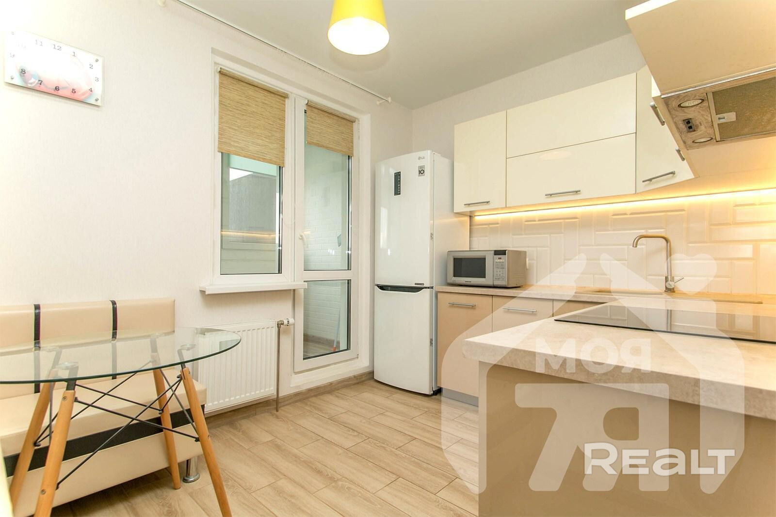 -Кухня площадью 9,3 м2 — просторная, что редко встречается в 1‑комнатных квартирах. Установлен современный кухонный гарнитур со встроеной посудамойкой, вытяжкой, духовым шкафом, а также варочной панелью. Есть место для обеденной зоны — можно завтракать, обедать, принимать гостей. Из кухни прямой выход на лоджию — удобство при готовке, возможность расширить пространство летом.