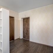 Отделка квартиры выполнена в нейтральных тонах, комбинированные обои стены выровнены под покраску.