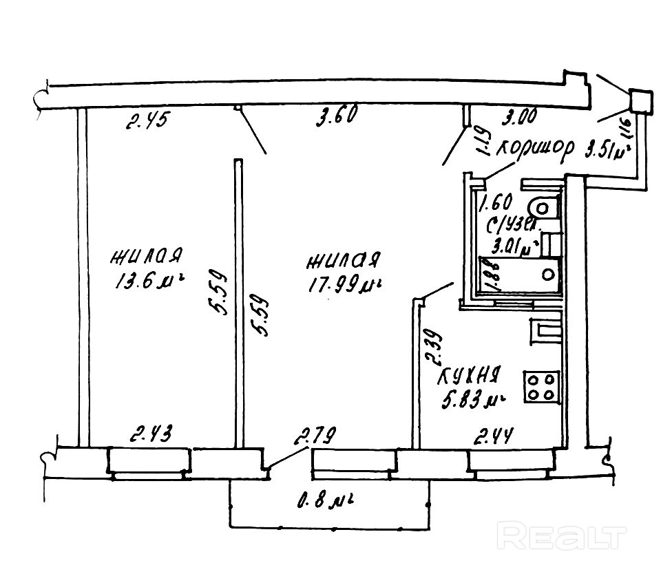 Комнаты: 13,6м.кв  и 17,99м.кв.