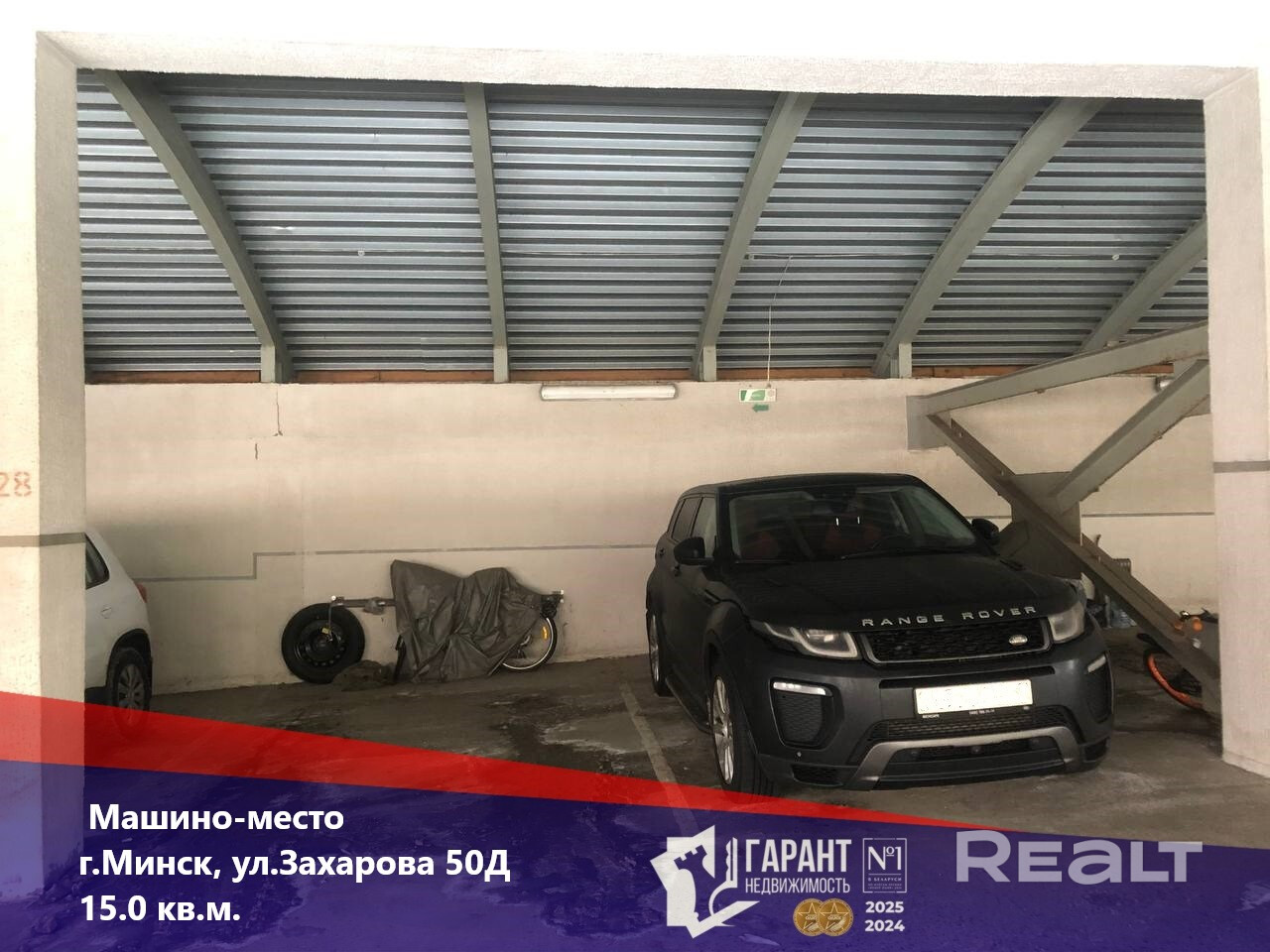 Общая площадь 15.0 кв.м. Находится на втором этаже трехэтажного крытого паркинга. Место находится в середине этажа, поэтому защищено от осадков.