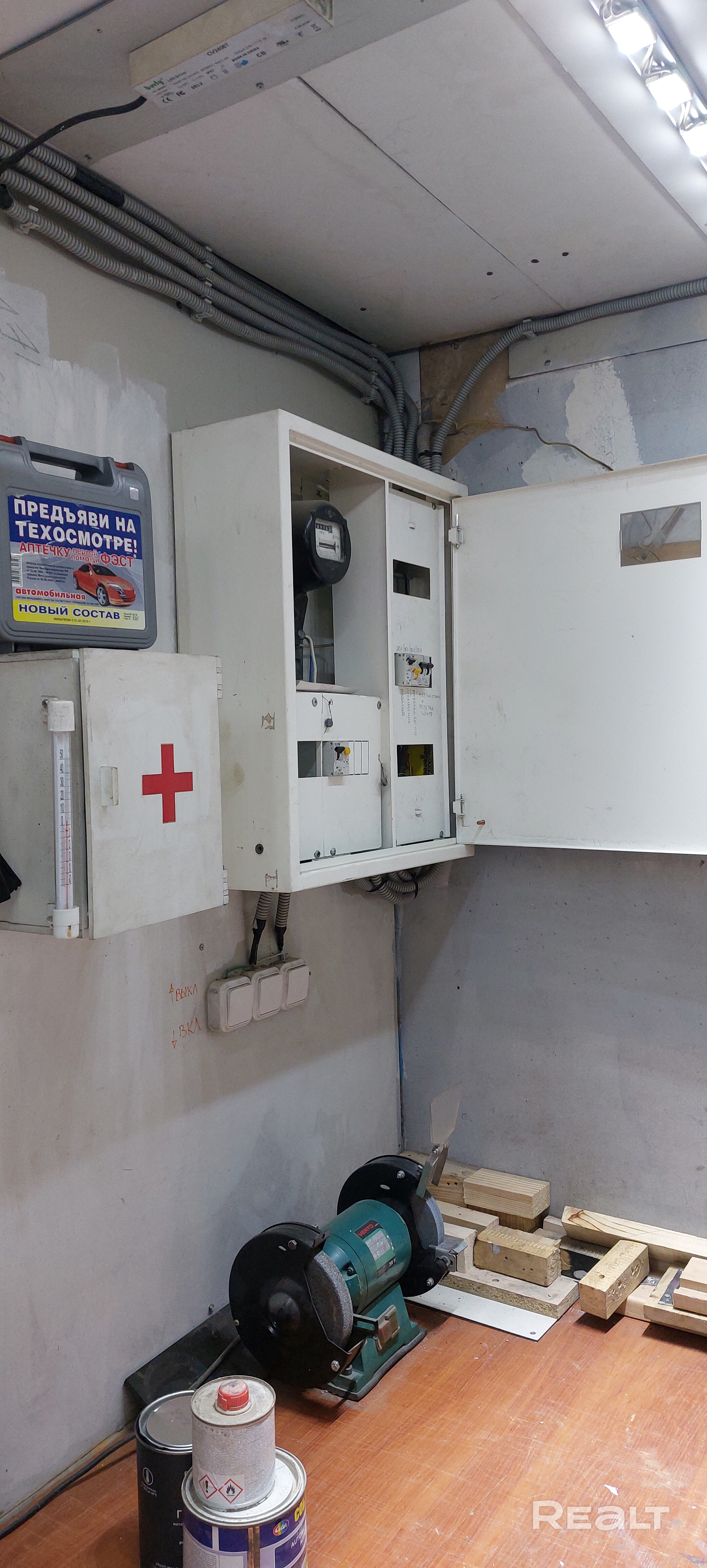 гараж в гаражном кооперативе. 2 уровня. на возвышении - не подтапливает ливнями и талыми водами. кровля утеплена, вытяжка принудительная вентиляция. стены обшиты стекломагнезитом, пол дерево+ алюминиевый композит, потолок подшит сэндвич панелью. стеллажи, освещение. оборудован под мастерскую. можно вместе с инструментом и материалами за 13000 :)