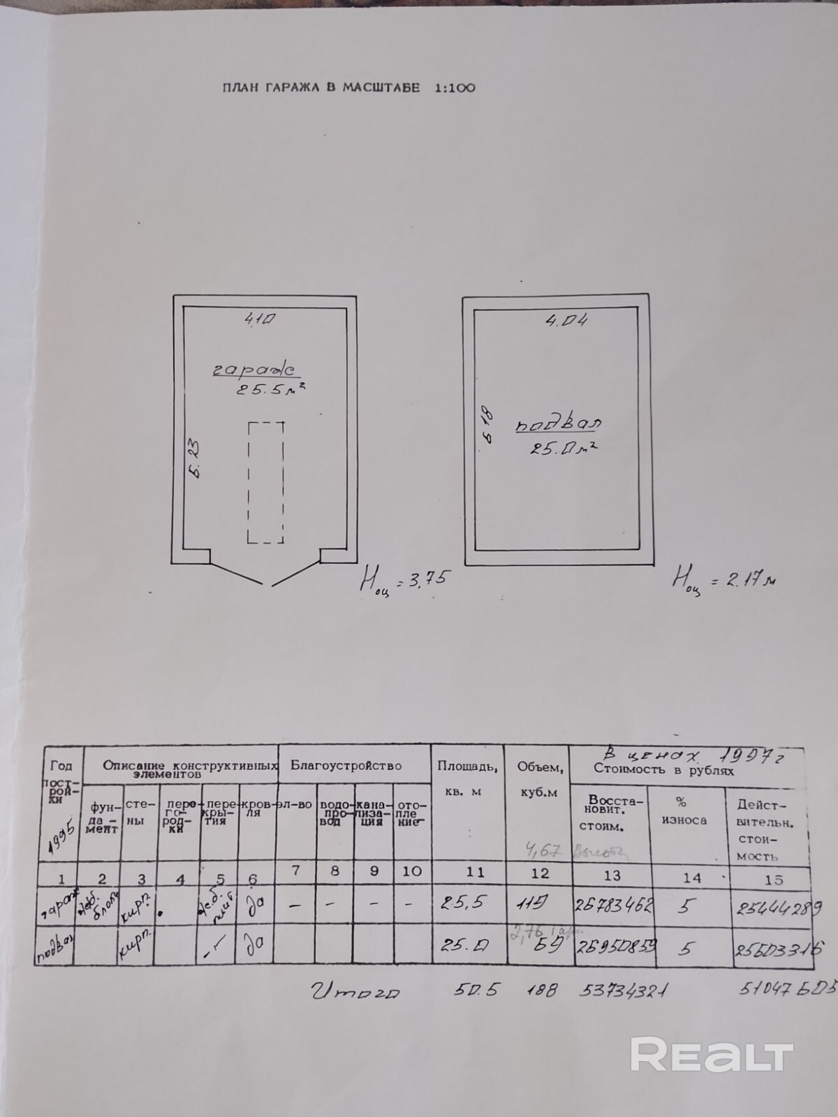 Продается гараж: 50,5 м2, 25,5 - основное помещение (потолок 3,75), 25 - подвал (2,17).