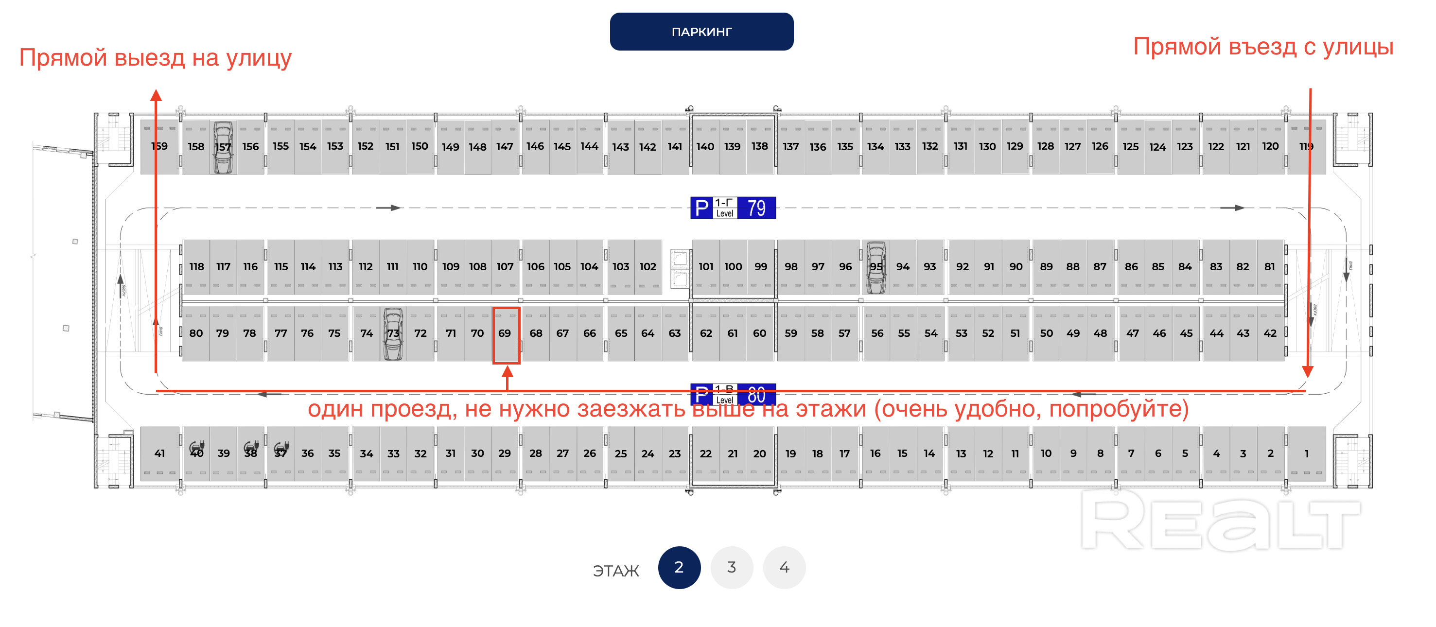 Продаётся машиноместо, номер 69. Не нужно ездить по этажам, на рисунке показано, что достаточно заехать на этаж и вы находитесь на том уровне, где у вас будет машиноместо. Также и съезжать. А цифра вообще бомба! Легко запоминается :) Торг.