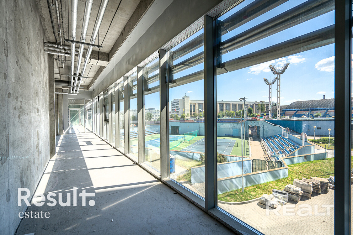Панорамные окна в пол с видом на проспект и теннисные корты.
