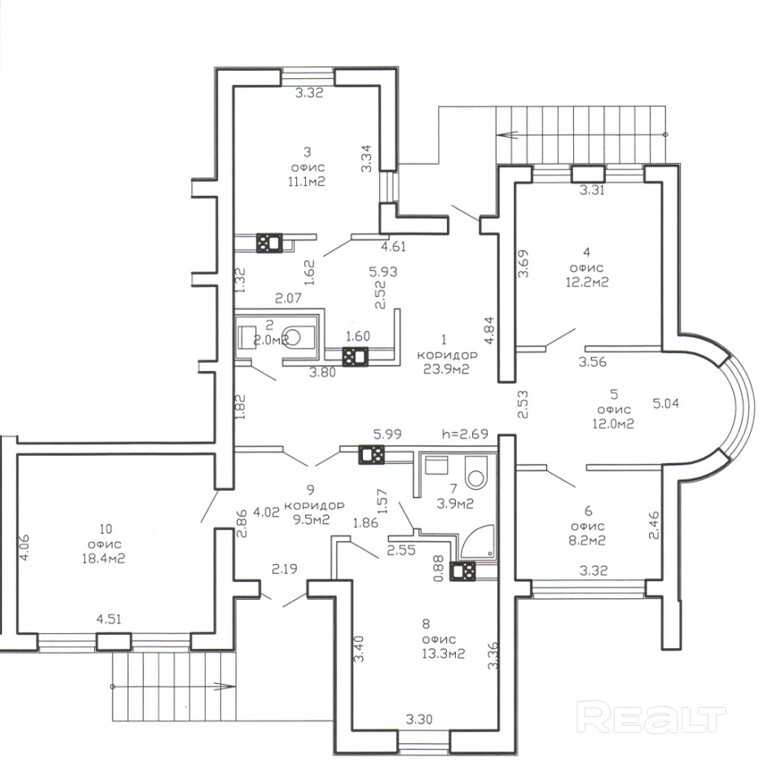 6 помещений (11,1 м2; 12,2 м2;12 м2; 8,2 м2; 13,3 м2; 18,4 м2), 2 сан. узла и мини кухню.