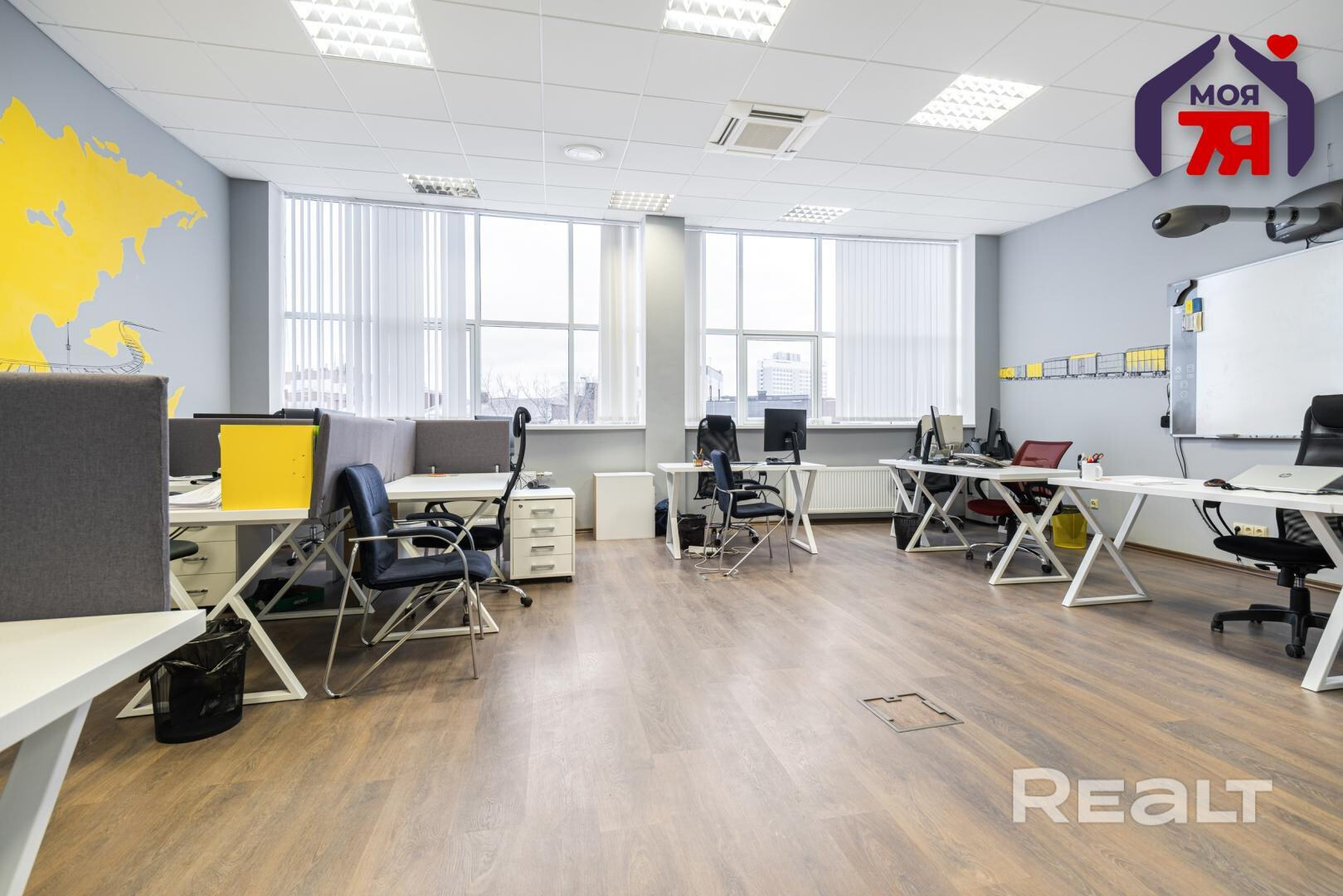 -Внутренняя планировка офиса включает в себя передвижные перегородки, что позволяет сотрудникам комфортно работать и при необходимости объединять/разделять офис на зоны.