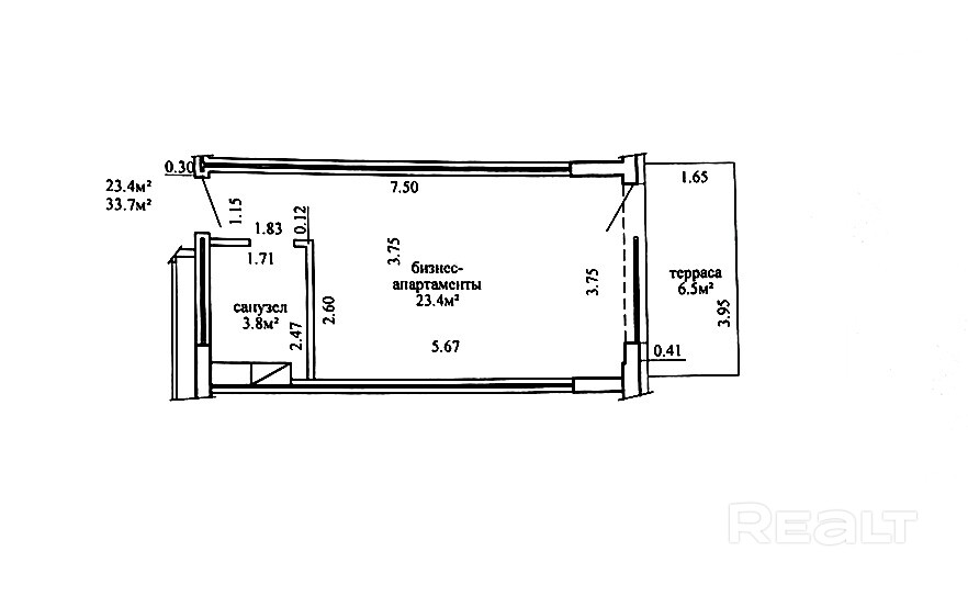 • Площадь: 33 кв.7 м. (свободная планировка, без отделки).