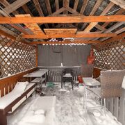 Уютная беседка для чаепитий на свежем воздухе, сарай для инвентаря и аккуратное место для хранения дров.
