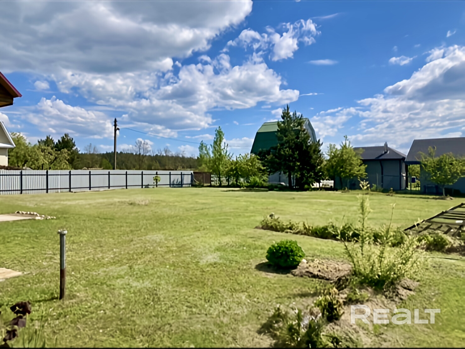 Огорожен забором — приватный, аккуратный.