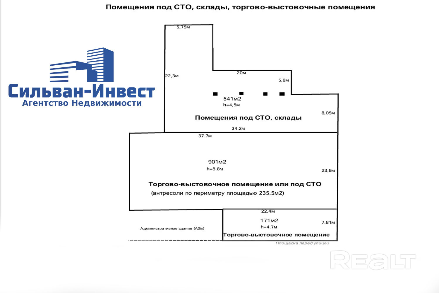Площадь помещений СТО, складов- 541 м2