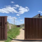 Участок 43 сотки, 2 въездных ворот, территория огорожена забором.