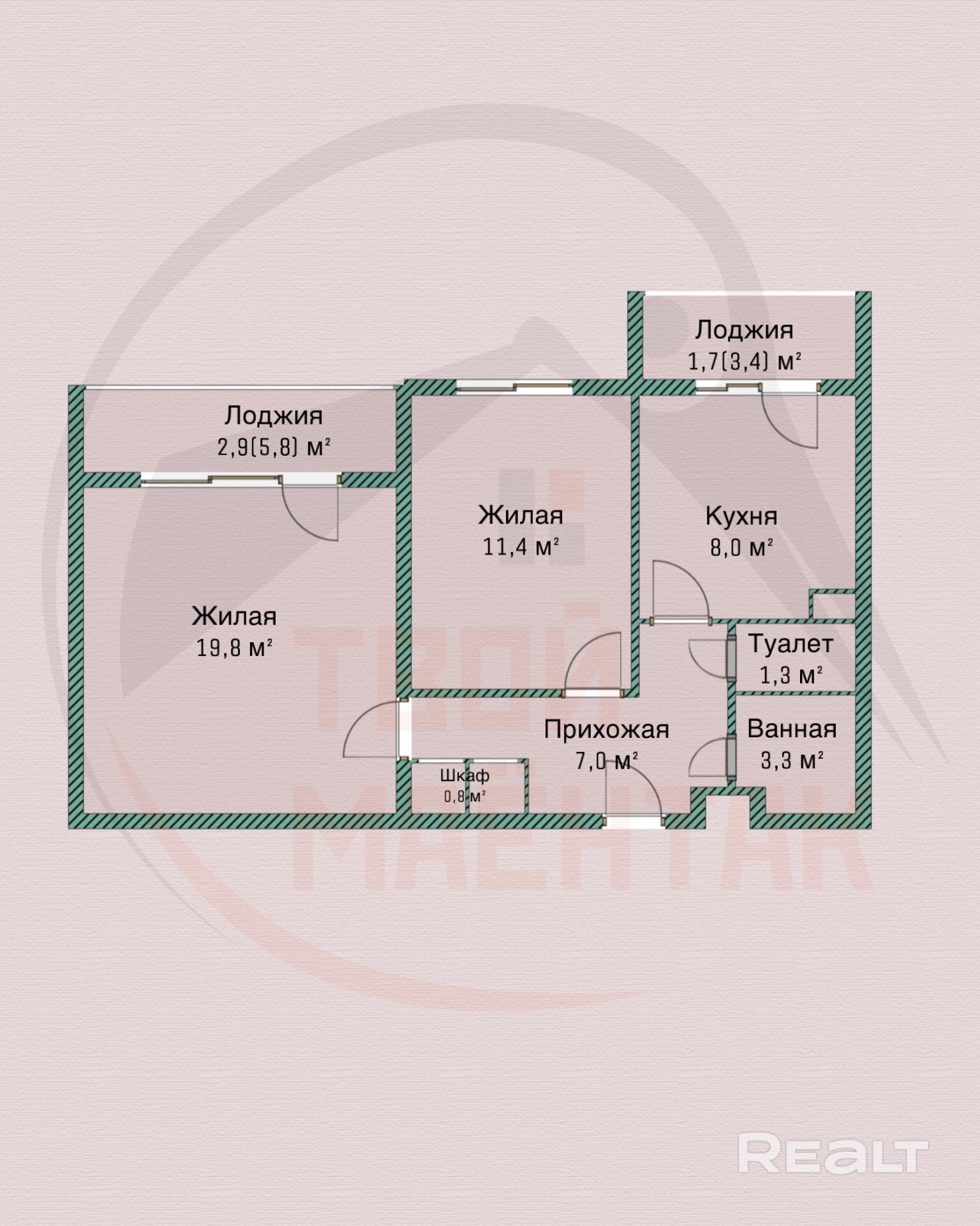 К местам общего пользования относится кухня с большой площадью - 8 кв. м и раздельный санузел.