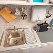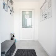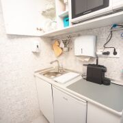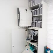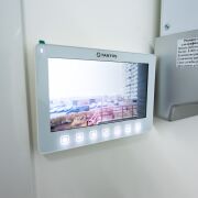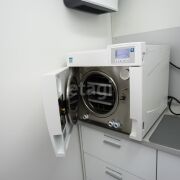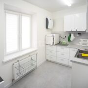 Ремонт внутри помещения выполнен в соответствии современными санитарными нормами. Цветовые решения – белый цвет как основной, светло-серый и бирюзовый. Применены керамическая плитка, сертифицированная краска для медицинских учреждений Condor Laubglanz, пластиковые медицинские двери выполнены по специальному заказу, медицинская мебель, раковины с антикоррозийным покрытием, дозаторы, салфетницы, электросушка.