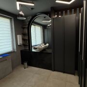 4. Рабочие места: В помещении предусмотрено 4 рабочих места, одно из которых ограждено перегородкой и имеет отдельный вход. Каждое рабочее место оборудовано мойкой, что удобно для оказания различных услуг.