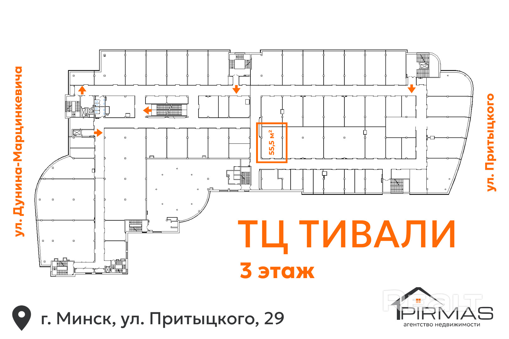 ✅ Приглашаем Вас ознакомиться с торговым помещением площадью 55,5 м2, расположенным на 3-м этаже ТРК «Тивали» (г. Минск, ул. Притыцкого, 29). Объект занимает угловое расположение, имеет витрину как по фасаду, так и на боковой стороне, что обеспечивает лучшую обзорность и расширяет возможности оформления и зонирования пространства.