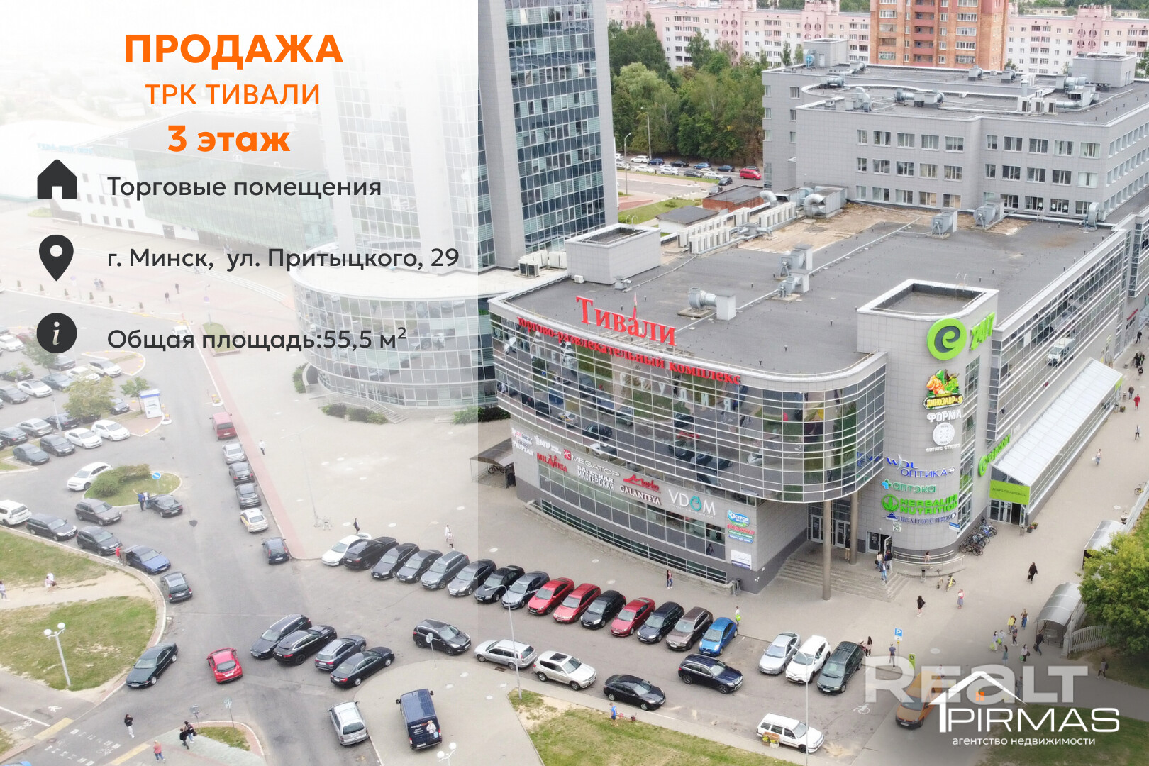 ✅ Приглашаем Вас ознакомиться с торговым помещением площадью 55,5 м2, расположенным на 3-м этаже ТРК «Тивали» (г. Минск, ул. Притыцкого, 29). Объект занимает угловое расположение, имеет витрину как по фасаду, так и на боковой стороне, что обеспечивает лучшую обзорность и расширяет возможности оформления и зонирования пространства.