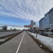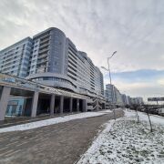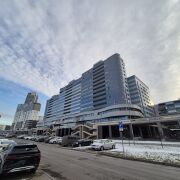 Два входа организовано с пешеходного стилобата, который соединяет "первую линию" жилой застройки на проспекте Победителей в микрорайоне "Лебяжий", один вход располагается на уровне земли.